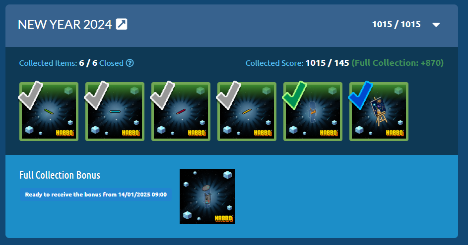 O item bônus é uma Roupa de Pintor de Cavalete e já está disponível para resgate. Para resgatar o item bônus, você deverá ter os 6 itens da Coleção Ano Novo 2024. No momento eles só podem ser comprados de outras pessoas pela Immutable (coleção Habbo Furni).