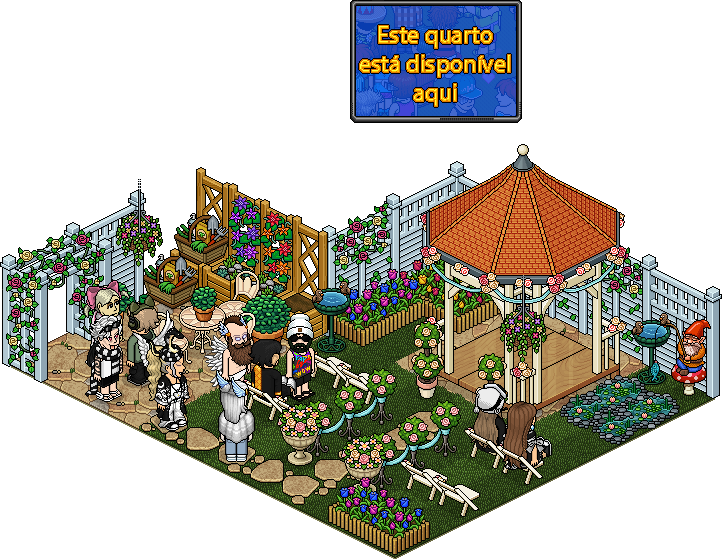 Nesta quinta-feira (13/02), o Pack Casório no Jardim foi disponibilizado no hotel novamente. Ele pode ser adquirido através da loja do hotel por 199 câmbios, 90 câmbios + 90 diamantes ou por R$ 49,99 na HabboShop. Contém um emblema exclusivo! Confira mais informações: