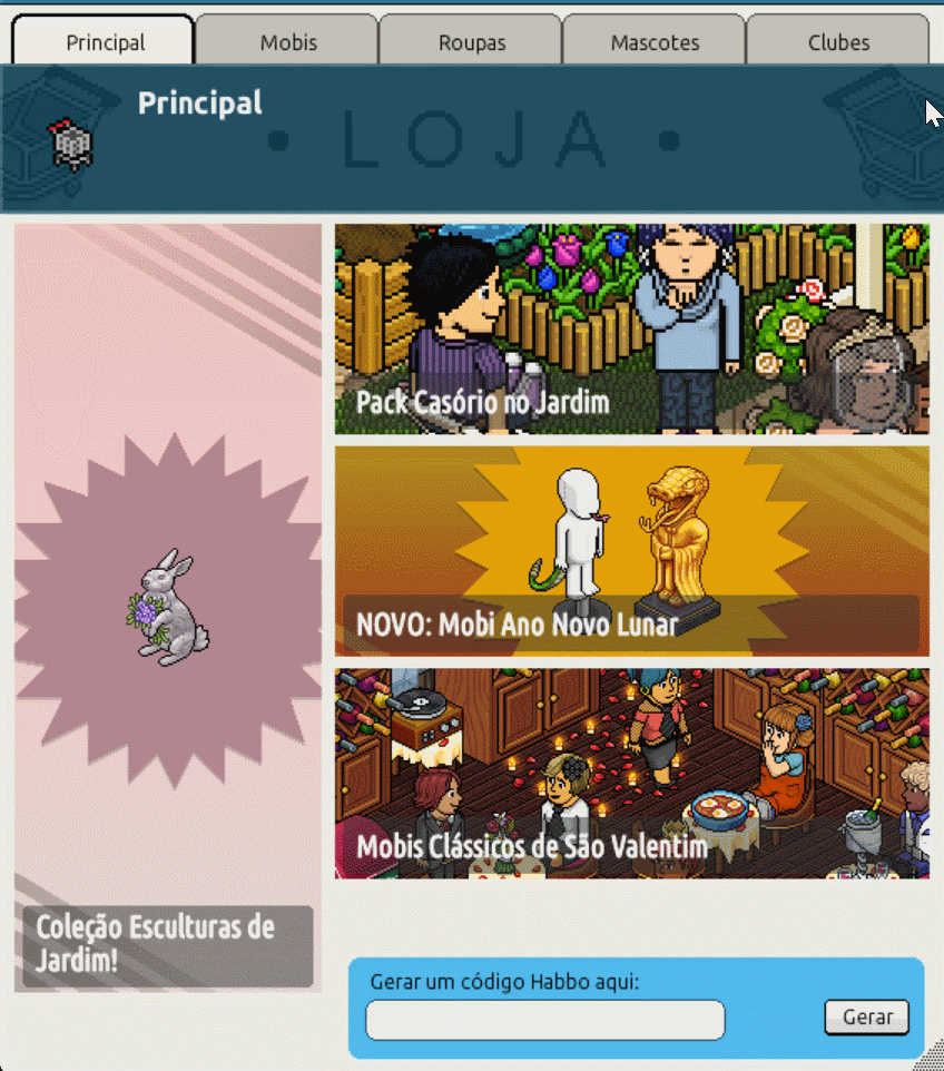 Nesta quinta-feira (13/02), o Habbo disponibilizou o novo mobi Escultura de Coelho. Ele pode ser adquirido através da loja do hotel por 15 câmbios + 5 diamantes. Contém um emblema exclusivo. Confira outras informações: