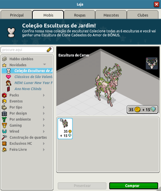 Nesta terça-feira (04/02), o Habbo disponibilizou o novo mobi Escultura de Veado. Ele pode ser adquirido através da loja do hotel por 35 câmbios + 15 diamantes. Contém um emblema exclusivo. Confira outras informações: